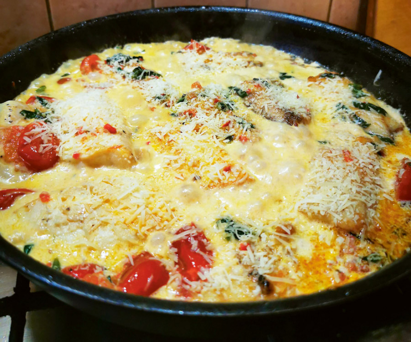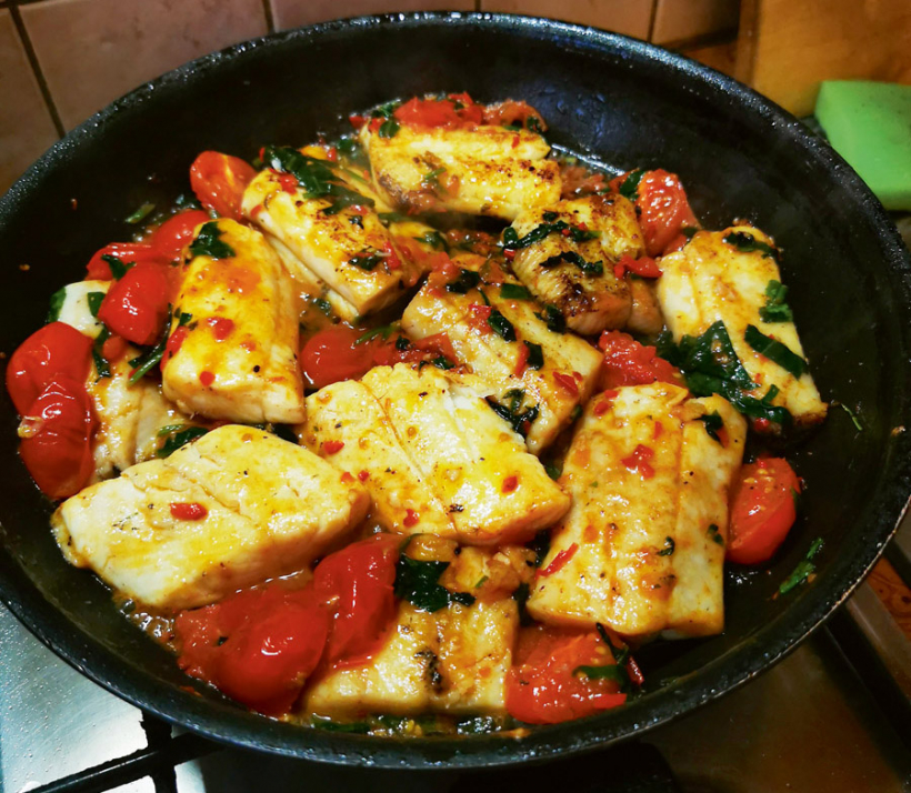 Sagriež mazos ķiršu tomātiņus uz pusēm un tāpat liek cepties eļļā, kam pievienots mazliet sviesta. Pievieno pāksti sakapātu čili piparu un spinātu lapas, sāli pēc garšas. Kad tomāti ar čili un spinātiem labi apcepušies un kļuvuši mīksti, pannā liek atpakaļ zivs gabalus, pārlej ar saldo krējumu un sautē. Kad zivs gandrīz gatava, pārber ar rīvētu parmezāna sieru.