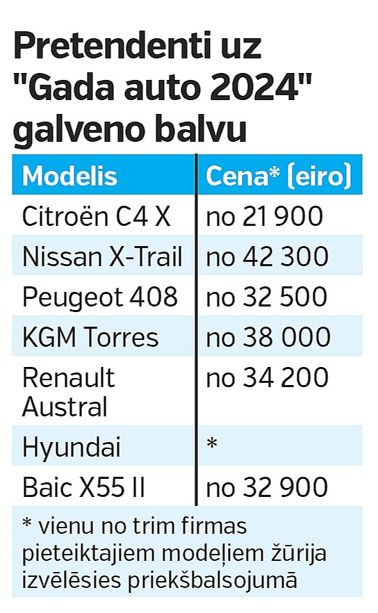 Žūrijas biedru baigi sarežģīto uzdevumu pēkšņi atvieglo konkursa organizatora Māra Ozoliņa atgādinājums, ka uz galveno titulu var pretendēt tikai automobiļi, kuri ir absolūti jauni – 2023. gadā radīti modeļi. "Feislifti" – iepriekšējo vizuāli, detaļās minimāli uzlabojumi pēc konkursa nolikuma (ne tikai mūsējā, līdzīgi dalībniekus atsijā visā Eiropā) uz galveno titulu nepretendē. Par tiem var balsot papildnominācijās. Bet "Gada auto 2024" tie nevar būt. Tā, lūk. Un, izķemmējuši šādā veidā savus 19 pretendentus (divi no 21 – pikapi – atsevišķā komercauto sadaļā jau iepriekš atskaitīti), secinām – paliek tikai septiņi (skat. tabulu).