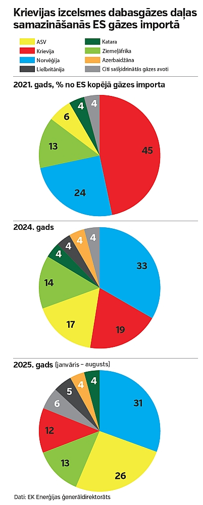 Eiropas Savienība 2024. gadā ir tērējusi fosilo enerģijas avotu – naftas un gāzes – importam 2,37% no visas valstu savienības iekšzemes kopprodukta, 364,2 miljardus eiro, liecina Eiropas Komisijas Enerģijas ģenerāldirektorāta dati. Citiem vārdiem sakot – Eiropa pērn katru dienu tērēja miljardu eiro, lai iepirktu naftu un gāzi, jo ES teritorijā naftas un dabasgāzes avotu gandrīz nav. Lai gan 2,37% un 364 miljardi eiro 2024. gadā ir daudz, taču jāapzinās arī tas, ka 2022. gadā, kad Krievija iebruka Ukrainā un pilnībā izpaudās Krievijas mākslīgi radītā gāzes deficīta sekas, kas raisīja paniku daudzu ES valstu galvaspilsētās, bet panikas maksimuma brīdī izraisīja pat septiņkārtīgu gāzes cenu pieaugumu, ES par fosilo energoresursu importu iztērēja 604,6 miljardus eiro, kas bija apmēram 3,7% no visa ES kopprodukta. Protams, te runa ir par visu fosilo resursu importu, ne tikai Krievijas, taču pēdējā pirmskara gadā Krievija Eiropai piegādāja gandrīz pusi visas dabasgāzes (45%), 27% naftas un 30 līdz 33% naftas produktu – proti, tai bija dominējošas tirgus pozīcijas visās energoresursu grupās. 2022. gada notikumi atskurbināja daudzu Eiropas politiķu galvas, jo kopš pagājušā gadsimta 70. un 80. gadiem rūpīgi būvētā ilūzija par to, ka Rietumeiropa varēs cepuri kuldama attīstīt savu ekonomiku un celt dzīves līmeni, balstoties uz relatīvi lētākām PSRS un vēlāk Krievijas gāzes un naftas piegādēm, sašķīda sīkās druskās pret Krievijas militāristiskā imperiālisma klinti. Jāpiebilst, ka bieži dzirdētais izteiciens par "lēto krievu gāzi un naftu" ir tikai daļēji patiess – Krievijā neviens nebija tāds muļķis, lai kaut ko pārdotu lēti, ja var pārdot dārgāk. Vienkārši pa cauruļvadiem piegādātās gāzes cena ilgtermiņa līgumos tika noteikta tāda, lai neielaistu tirgū konkurentus un būtu pēc iespējas neizdevīgi piegādāt sašķidrināto dabasgāzi no ASV vai Kataras – diviem Eiropai tuvākajiem sašķidrinātās dabasgāzes avotiem. Lai panāktu šādu situāciju, cauruļvadu gāzes cena tika noteikta 8–12 eiro par megavatstundu (MWh) zemāka nekā sašķidrinātās gāzes cena, kas atbilst apmēram 25–35% cenas starpībai 2021. gada cenās.
