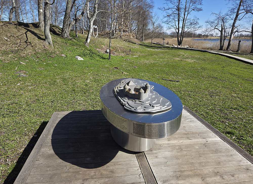 Gan vecajai, gan jaunajai laipai ar ķēdēm pielikti enkuri, citādi stiprā vējā tā sasveroties šķība. Starp jauno un veco pontonu ceļu neliels posms veidots kā grants taka, ņemot vērā ezera krastmalas pārpurvojušos daļu. Te agrāk bijis aizaudzis ar krūmiem, nācies visu iztīrīt, darbu gaitā atrasti veca bruģa fragmenti, jo sensenos laikos te droškās brauca pa ceļu un tālāk pa tiltu uz salu, kur bijis cietoksnis, stāsta pārvaldes vadītājs. Vietā, kur pirms 300 gadiem bijis tilts, 2020. gadā uzlikts pirmais pontonu takas posms. Tagad gan vietējie, gan atbraucēji var aiziet pa pontonu laipu līdz 1,8 ha lielajai salai un apiet tai apkārt, iepazīstoties ar šīs vietas vēsturi, – kopā no peldvietas sanākot 1000 soļu. No viduslaiku cietokšņa, kas sākotnēji bijis klosteris "Marienhaus" (celts 1293. gadā, no tā arī radies senais Viļakas nosaukums Marienhauzena), palikušas vairs tikai drupas, jo nocietinājums ar pili nopostīts Ziemeļu karā. Uz salas ar "Leader" projekta atbalstu izvietots senās pils makets ar savu vēstījumu. Tas veidots tā, lai arī cilvēki ar redzes invaliditāti to varētu aptaustīt un gūt priekšstatu.