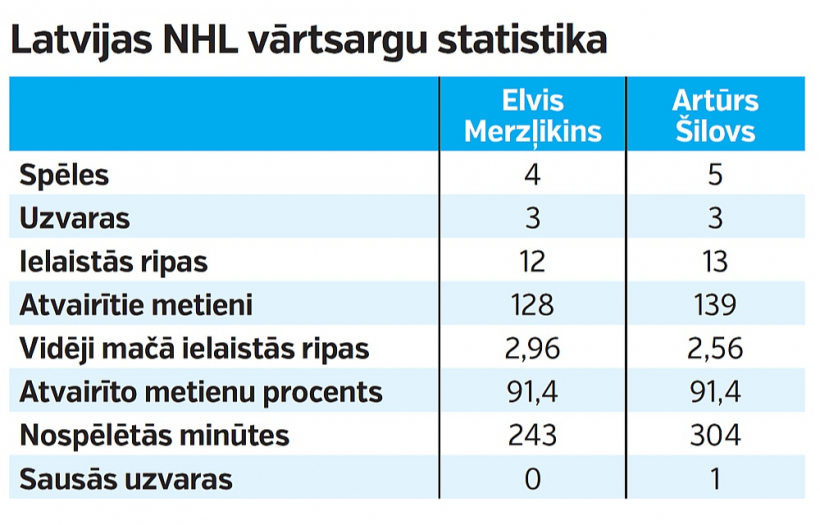 Merzļikins tiek rotēts ar Džetu Grīvzu, abiem tiekot laukumā ik pēc spēles, savukārt Šilovam līdzīga situācija ar Tristanu Džeriju. Arī statistikas rādītāji mūsējiem līdzvērtīgi, abiem pa trim uzvarām un vienāds atvairīto metienu procents (91,4%). Tās ir labas ziņas Latvijas izlasei un papildu galvassāpes valstsvienības vārtsargu trenerim Artūram Irbem, jo Milānā nāksies zīlēt, kuru vārtu vīru laist laukumā.
