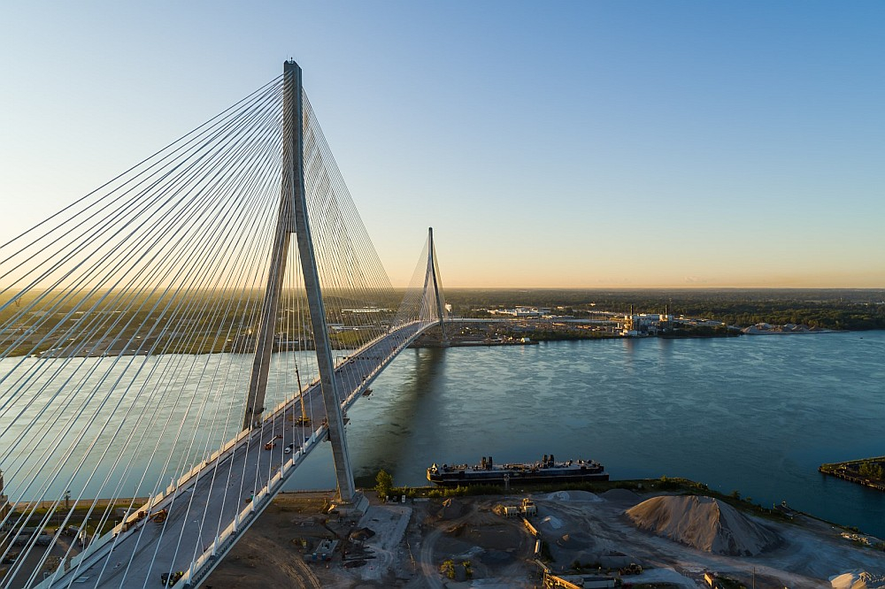 Slavenā kanādiešu hokejista Gordija Hova vārdā nosauktais tilts (attēlā) pār Detroitas upi savieno Kanādas Ontārio provinci ar ASV Mičiganas štatu. Tilta būve sākās 2018. gadā, un tajā ieguldīti aptuveni 4,7 miljardi ASV dolāru. Celtniecības darbus par Kanādas naudu, gandrīz tikai no kanādiešu materiāliem nodrošināja Kanādas valdībai piederošais uzņēmums "Windsor-Detroit Bridge Authority", bet bija paredzēts, ka īpašnieki uz pusēm skaitīsies Kanāda un ASV Mičiganas štats. Tagad Tramps pieprasa, lai vismaz 50% no Gordija Hova tilta piederētu ASV, citādi ASV no tā "nav nekāda labuma". Sarunas esot jāsāk "nekavējoties". Tilta atklāšanai pēc izmēģinājumu veikšanas jānotiek šī gada sākumā. Novērotājiem nav īsti skaidrs, kā Tramps grasās bloķēt būvniecības noslēgumu.