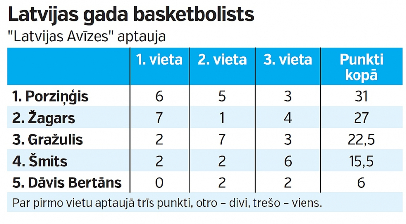 "Latvijas Avīzes" veiktā sporta žurnālistu un basketbola treneru, speciālistu aptauja uzrādīja citus rezultātus – pirmā vieta sīvā cīņā Kristapam Porziņģim, otrais Artūrs Žagars, trešais – Andrejs Gražulis.
