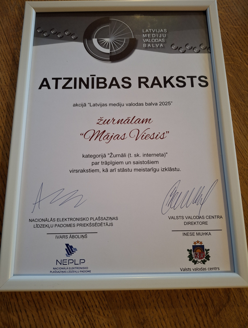 Atzinības rakstu par trāpīgiem un saistošiem virsrakstiem, kā arī stāstu meistarīgu izklāstu saņēma žurnāls "Mājas Viesis". Paldies par novērtējumu un iedvesmu turpmākajiem darbiem.