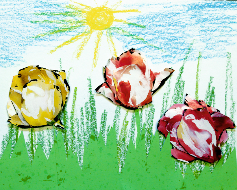 - Ar abpusējās līmlentes palīdzību visus attēlus vajadzīgā kārtībā uzlīmē uz iepriekš izkrāsota zīmējuma.