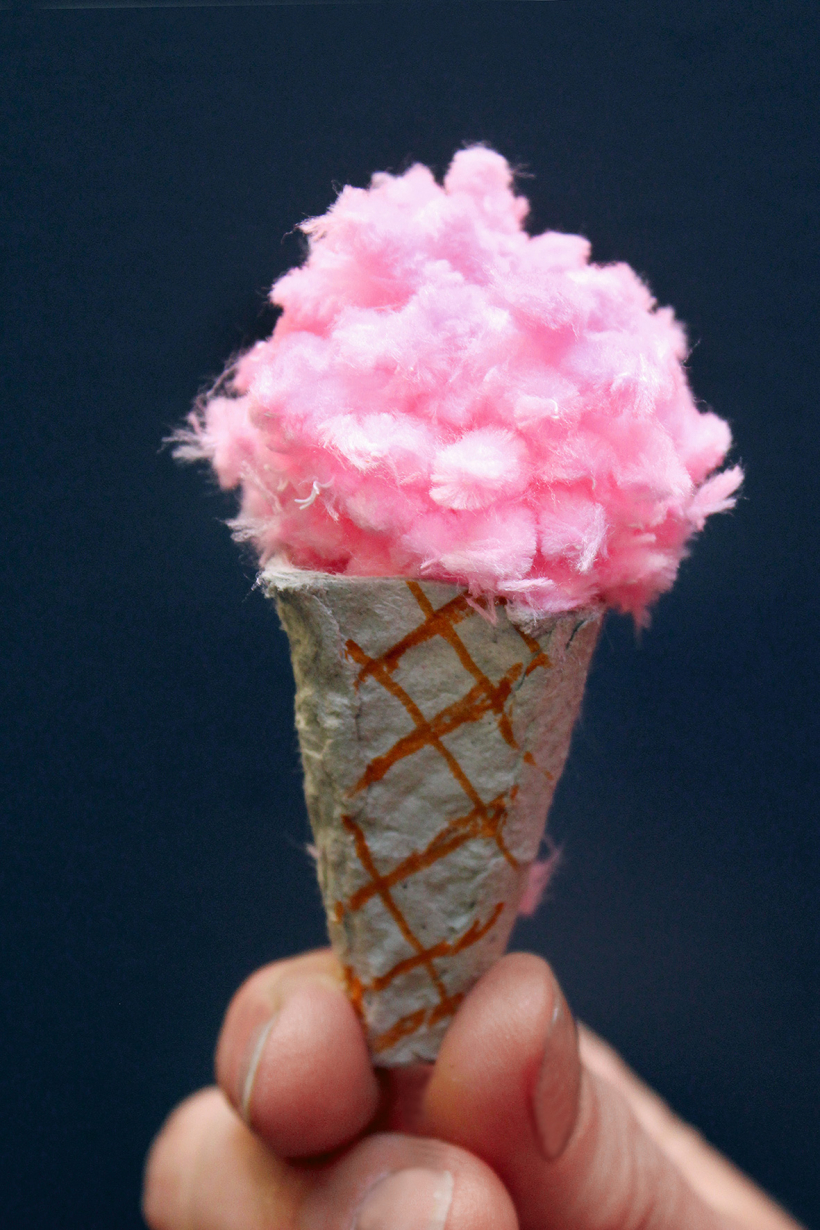 - Dzijas bumbuli iesēdina vafelē un piefiksē ar karsto līmi.