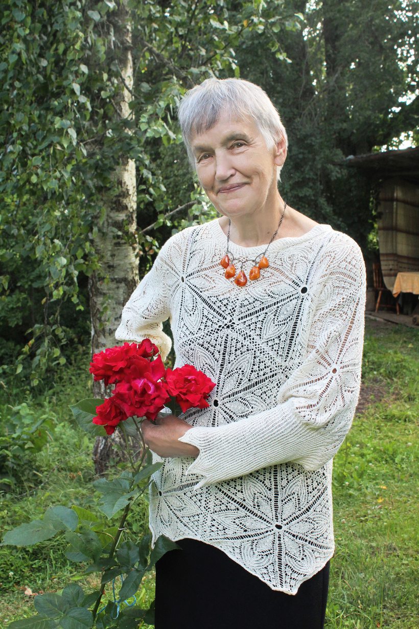 Mirdza Filipenoka gan ada, gan tamborē, izvēloties interesantus rakstu salikumus. Šo džemperi viņa demonstrēja pašdarināto tērpu skatē “Radošais nemiers”.