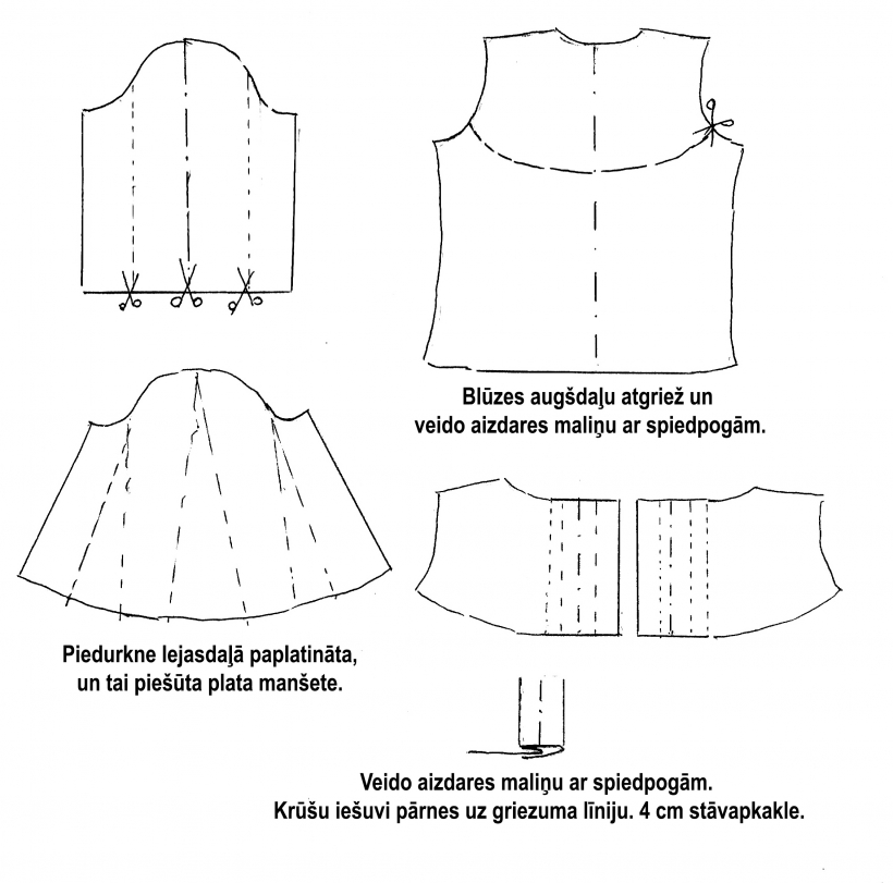 Blūze šūta no senāku laiku auduma ar platām manšetēm un stāvapkaklīti. Aizdare ar spiedpogām. Apdarei izmantota zaļa lina mežģīne. Piedurknes pamatpiegrieztnē ir trīs iegriezumi, lai, tos paverot, iegūtu kuplumu piedurknes lejasdaļā. Stāva priekšpuses piegrieztnē atgriež augšdaļu un pārnes krūšu iešuvi, lai apakšējo daļu var piekrokoti piešūt augšdaļai. Augšdaļu pārgriež pa viduslīniju un pieliek klāt aizdares maliņas nepieciešamo platumu.