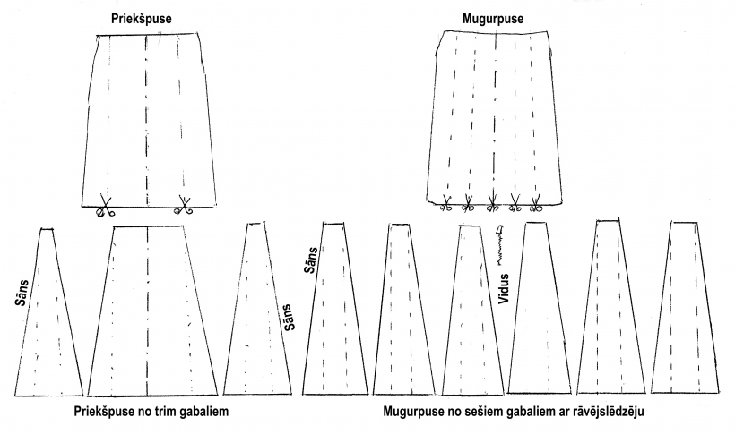 Jūgendstila svārku priekšdaļa ir taisna, gluda, mugurpuse – kuplāka. Es šajā tērpā dejoju, tāpēc apakšmalai jābūt pietiekami platai. Izmantoju vilnas audumu. Svārki modelēti no pamatpiegrieztnes: priekšpusei divas, mugurpusei sešas daļas. Katra apakšmalā paplatināta tik, cik audums to pieļauj. Aizdares rāvējslēdzējs iestrādāts mugurpuses vidusdaļā. Jostas daļā to nosedz viens jostas gals. Sānu vīlēs iestrādātas kabatas.