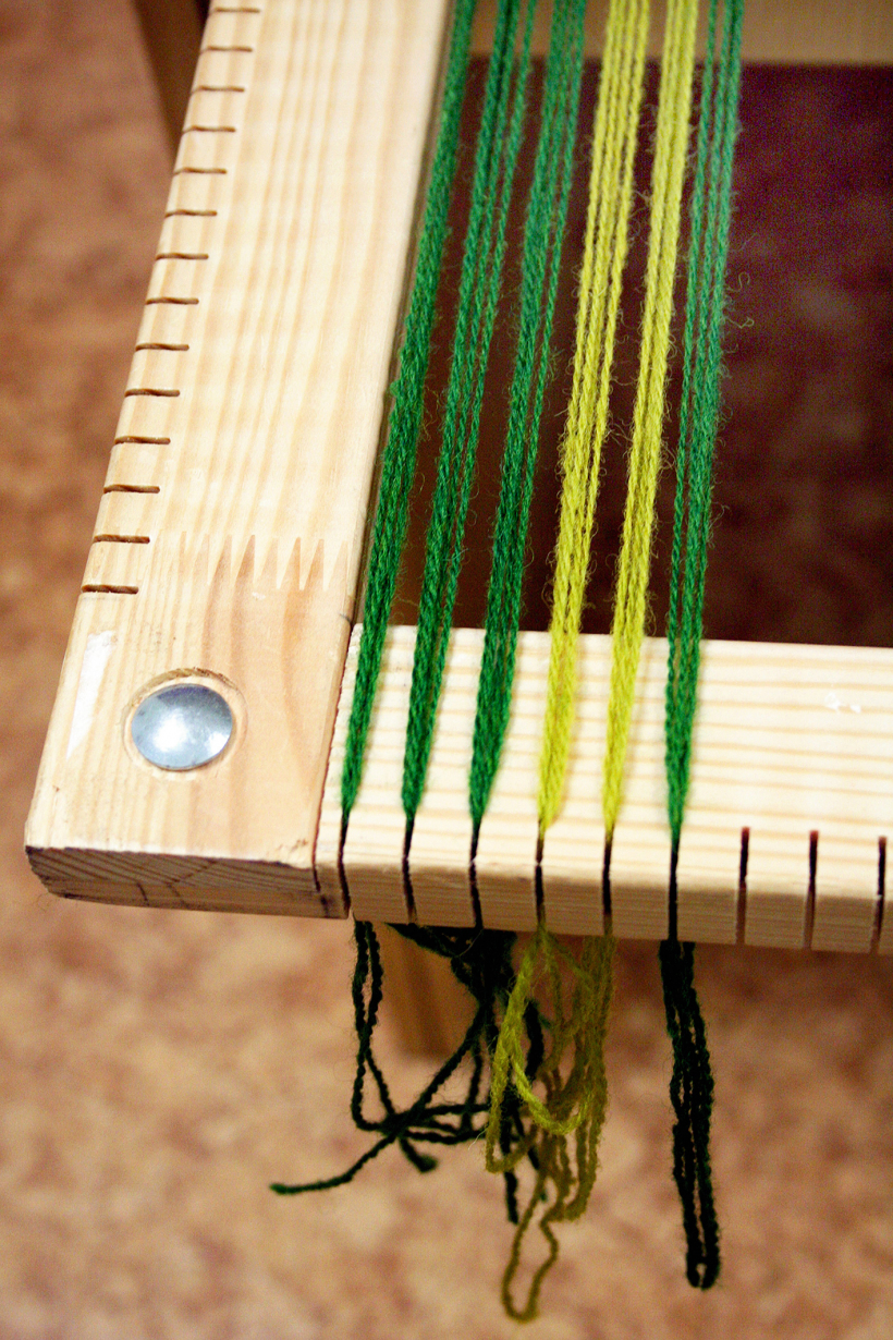 3. Sāk aizpildīt “zobus”, katrā gropītē nostiprinot četrus pavedienus velku virzienā.