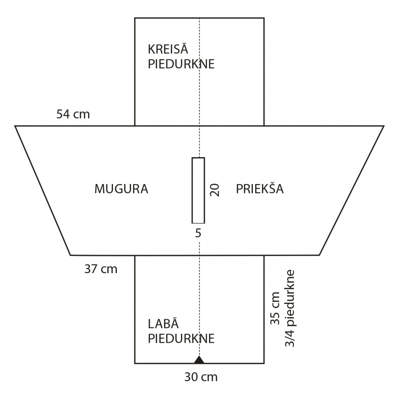 - Priekšpuses un mugurpuses daļas var adīt taisni vai arī veidot slīpu apakšmalu, pakāpeniski pieaudzējot valdziņus un saglabājot 6 cm labisko valdziņu joslu.