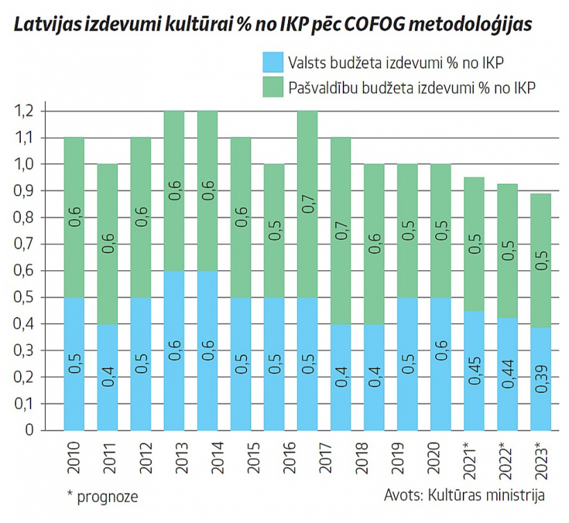 "Procentuālie izdevumi no iekšzemes kopprodukta (IKP) kultūrai sarūk, un tas patiesi ir satraucoši," tā 10. oktobrī Saeimas Izglītības, kultūras un zinātnes komisijas sēdē teica kultūras ministre Agnese Logina. 2010. gadā – finanšu krīzes gadā – kopējais kultūrai atvēlēto līdzekļu apjoms bija 0,5% no IKP, bet 2024. gada prognoze, ieskaitot arī prioritāros pasākumus, norāda, ka ejam virzienā uz leju, un tie ir 0,39% no IKP, piebilda Kultūras ministrijas (KM) valsts sekretāre Dace Vilsone.