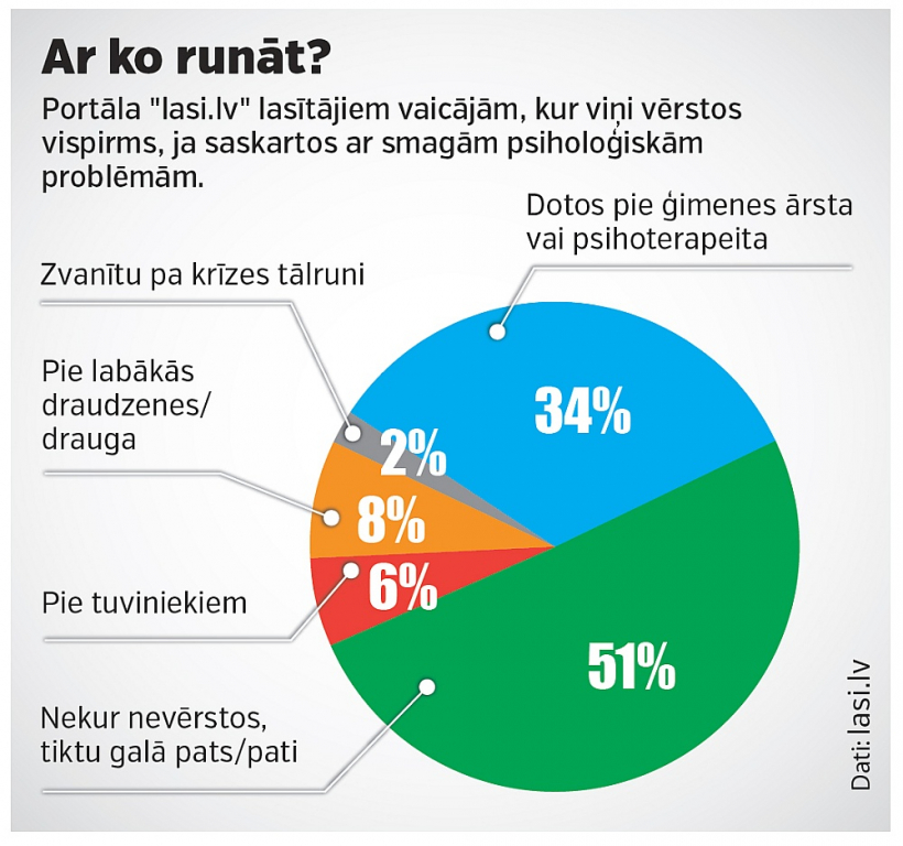 Krīzes un konsultāciju centra "Skalbes" vadītāja Anda Švinka: "Mūsu krīzes diennakts tālruņa 116123 konsultanti sarunājas ar zvanītāju. Ar cilvēkiem runā speciāli apmācīti krīzes konsultanti, kuri sniedz pirmo emocionālo atbalstu, palīdz pašiem saprast, kā tikt galā ar grūtībām, cenšas noskaidrot, kas tieši noticis. Zvanītājus uzklausa bez vērtēšanas. Tas ļoti palīdz un atvieglo. Ar konsultantu ir daudz vieglāk nekā ar ģimeni vai draugiem, jo nav gaidu un emocionālās iesaistes, nav padomu vai pārmetumu, tikai uzklausīšana un spriedzes mazināšana."
