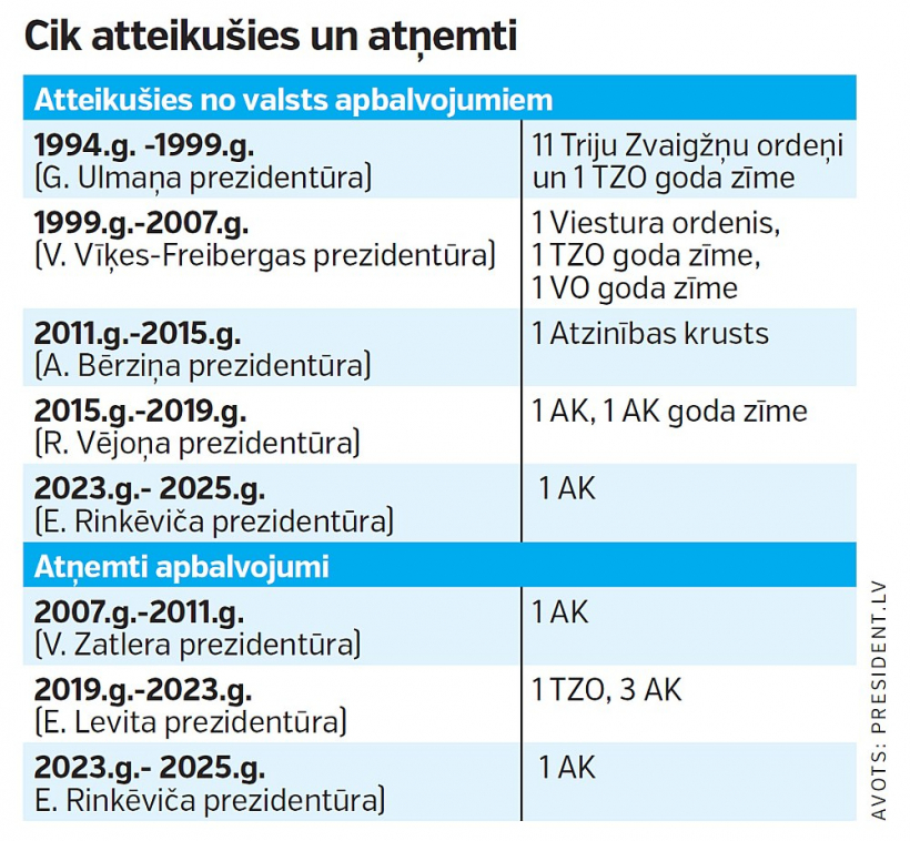 Valsts apbalvojumu likums paredz, ka atņemtie vai atdotie valsts apbalvojumi nododami atpakaļ Ordeņu kapitulam glabāšanai Valsts prezidenta kancelejā. Valsts prezidenta kancelejas Mediju centra komunikācijas speciālista Reiņa Grāvīša atbilde uz "Latvijas Avīzes" jautājumu par kancelejā nodoto apbalvojumu "kolekcijas" šābrīža stāvokli liecina, ka tā ir samērā plaša: Viestura ordenis, V šķira; Viestura ordeņa pirmās pakāpes goda zīme; Atzinības krusts, III šķira; Atzinības krusts, IV šķira trīs komplekti un Atzinības krusts, V šķira.