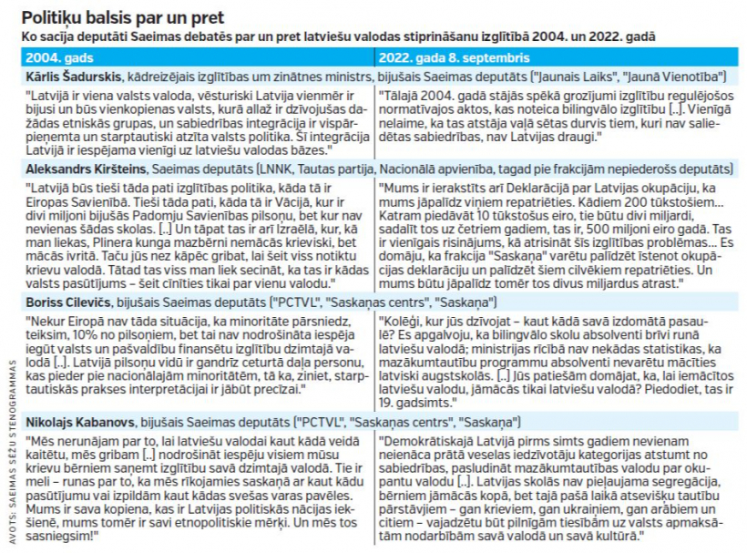 "Ja tolaik būtu lēmums, ka viss notiek valsts valodā, tas kļūtu par farsu," tā savulaik ieviesto bilingvālo izglītības sistēmu kādreizējās Latvijas krievu skolās pamato bijušais izglītības ministrs (07.11.2002.–09.03.2004. un 11.02.2016.–26.11.2018.) Kārlis Šadurskis.