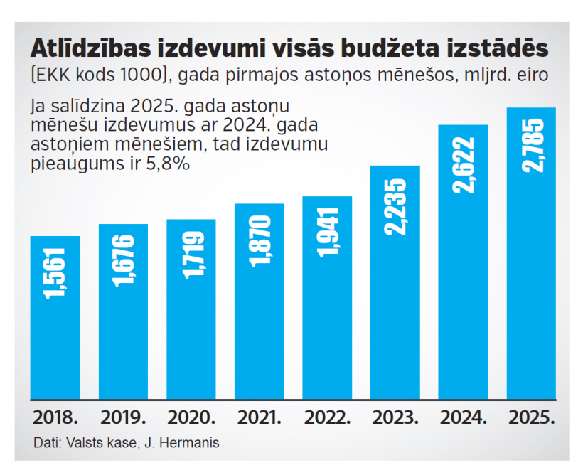 Pērn 14. oktobrī Ministru kabinets apstiprināja šo 2,6% ierobežojumu atlīdzības fonda pieaugumam publiskajā pārvaldē 2025. gadā salīdzinājumā ar 2024. gada plānu. Straujais atalgojuma pieaugums publiskajā sektorā sākās 2022. gadā. Tad tika pieņemti grozījumi Atlīdzības likumā, kas paredzēja pakāpenisku atalgojuma celšanu valsts un pašvaldību institūcijās ar mērķi panākt, lai tas tuvotos atlīdzībai privātajā sektorā – būtu 80% līmenī no līdzvērtīga darba atalgojuma privātajos uzņēmumos.