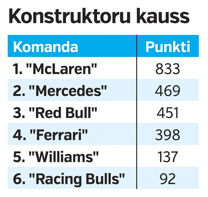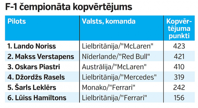 Pirmās formulas (F-1) 2025. gada čempionāta noslēdzošajā posmā Abū Dabī Makss Verstapens no "Red Bull" komandas izcīnīja pārliecinošu uzvaru, taču ar to bija par maz, lai nīderlandietis piekto gadu pēc kārtas kļūtu par pasaules čempionu.