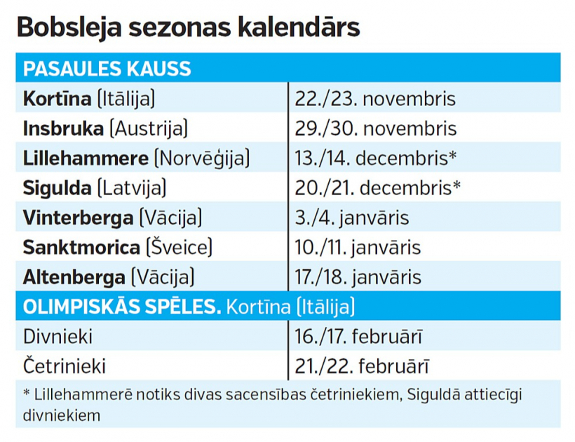 Sezona sāksies Kortīnā no jauna uzceltā trasē, kurā mūsējie vēl nav braukuši. Tur šosezon tiks noskaidroti arī olimpiskie medaļnieki, taču Latvijas bobslejistiem vispirms spēlēm vēl ir jākvalificējas. Kvotas tiks sadalītas pēc vietām kombinētajā pasaules rangā.