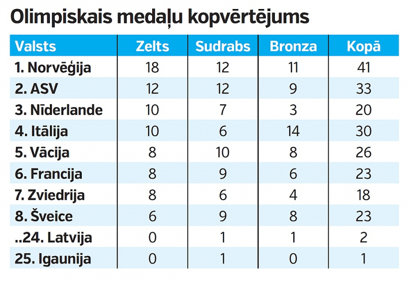 Latvija ar Ievas Botas sudrabu un Roberta Krūzberga bronzu kopējā medaļu vērtējumā ir 24. vietā, vienu pozīciju aiz mums Igaunija, kurai sudraba godalgu frīstailā izcīnīja Henrijs Sildaru, bet dienvidu kaimiņi lietuvieši palika tukšā, labāko sniegumu parādot daiļslidošanā pāriem (sestā vieta). Pie medaļām tika 29 valstis no 92 startējušajām.