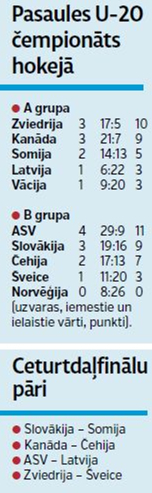 Uzmanības centrā Arta Ābola trenētā Latvijas U-20 izlase, kas cīnās junioru pasaules čempionātā Zviedrijas pilsētā Gēteborgā un šodien plkst. 18 ceturtdaļfinālā spēlēs pret ASV vienaudžiem.