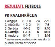 Latvijas futbola izlase Pasaules kausa kvalifikāciju aizvadījusi sev visai tipiskā noskaņā un vietā – esam pirmspēdējie grupā.