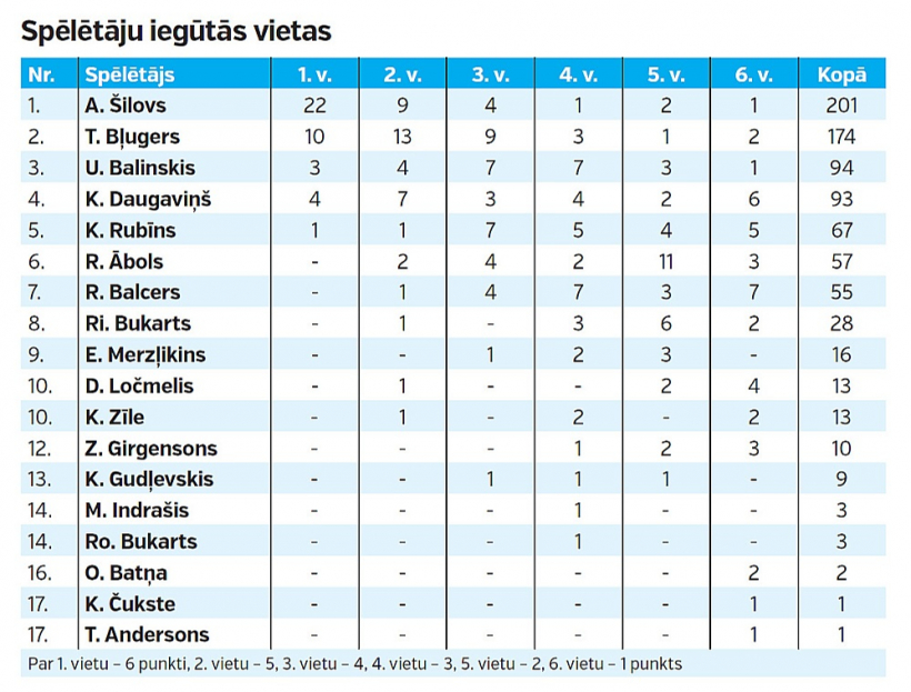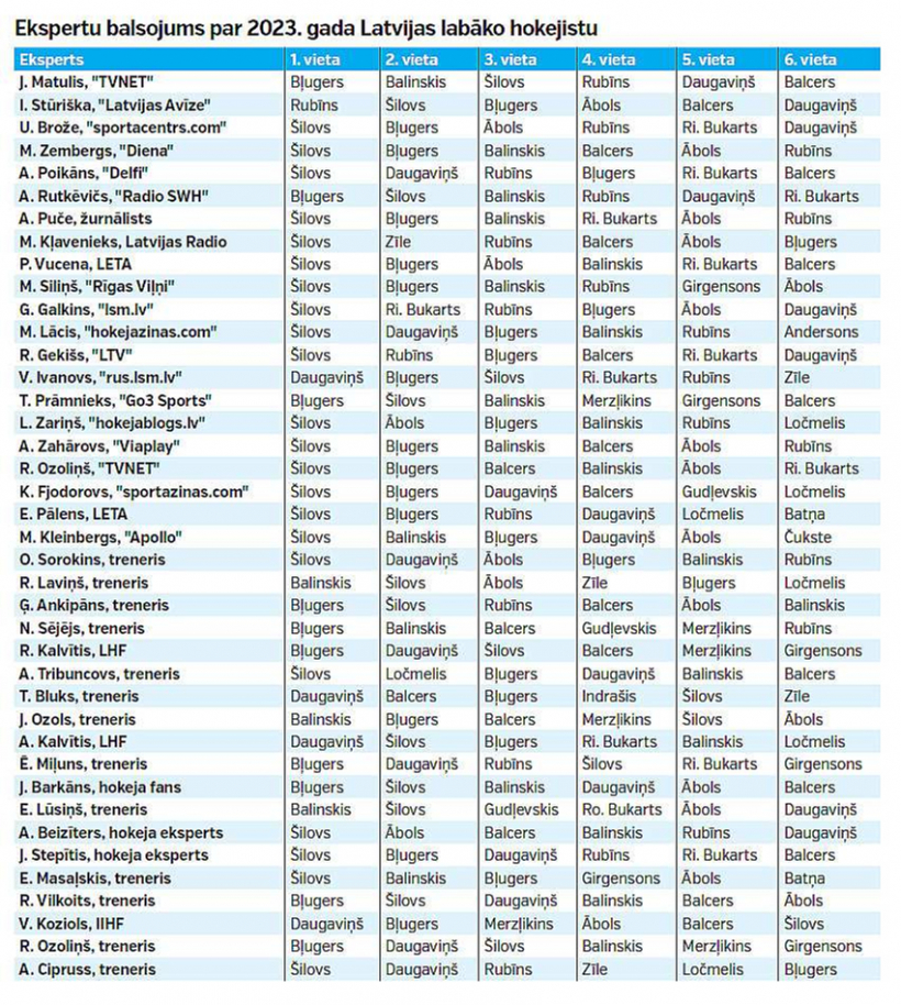 Kā ierasts, aptaujājām 40 hokeja ekspertus un mediju pārstāvjus, kuri nosauca savu TOP 6. Par pirmo vietu seši punkti, otro – pieci un tā tālāk.