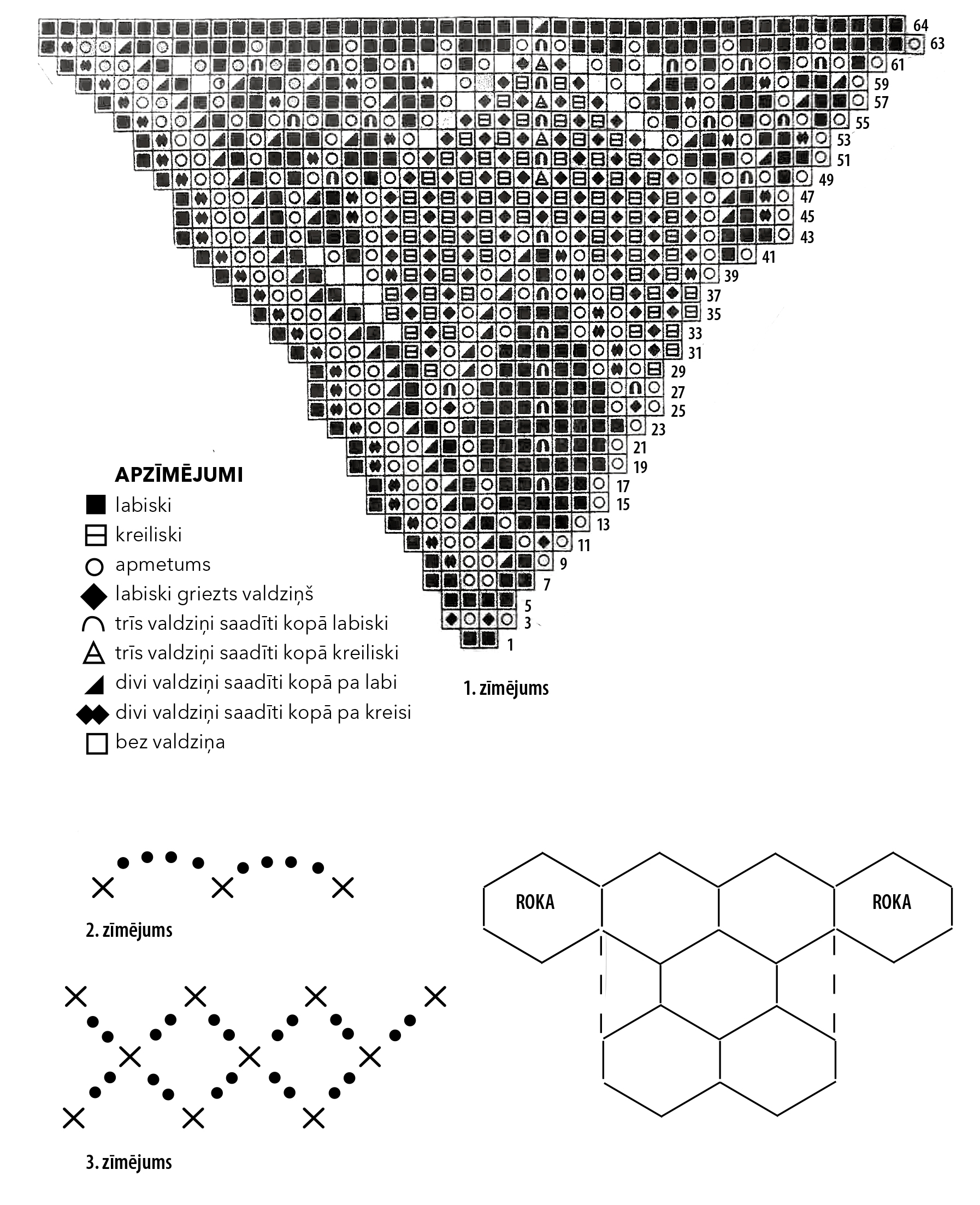 - Roku garumu veido, uzlasot sešstūru malas valdziņus. Ada vienu kreiliski, vienu – labiski grieztu valdziņu. Roku galus veido tāpat, kā adīja, sākot no 41. rindas motīva.