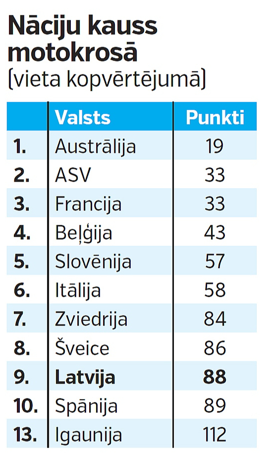 Brāļi Kārlis un Jānis Reišuļi kopā ar Paulu Jonasu svētdien ASV izcīnīja devīto vietu Nāciju kausā motokrosā, kas ir visu laiku otrs labākais sasniegums Latvijas motokrosa vēsturē.
